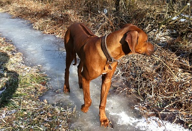 Auch Luna findet die Eisflächen am Rhein spannend und schlittert gerne darauf.