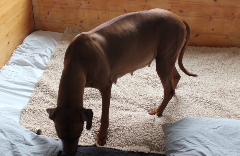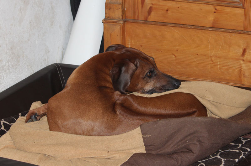 Unsere Runden werden etwas langsamer und kürzer, aber trotzdem sind wir regelmäßig mit ihr unterwegs. So langsam wird es eng im Bauch und wir liegen gerne zusammen schon in der Wurfkiste, da kann Berta sich schön ausstrecken …